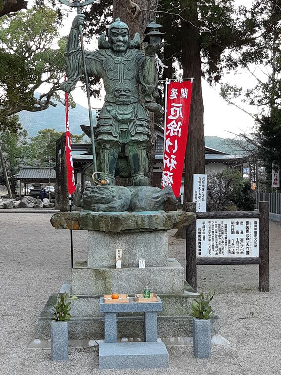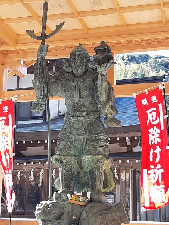 The statue of Bishamonten (Vaisravana) used to be enshrined open-air on top of the mountain, but when it returned to the shrine after restoration, it was again installed open-air at the foot of the mountain and on the north side of the precincts.