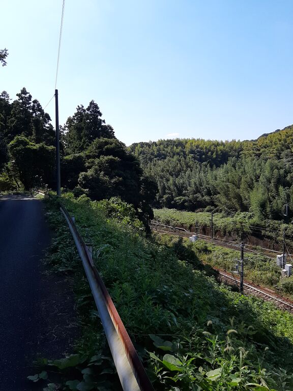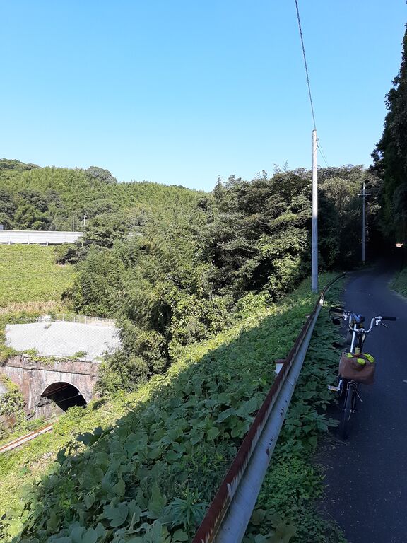 Going down the slope, the JR Kagoshima Main Line runs along the valley's right (west) side, after exiting the Jyoyama Tunnel.