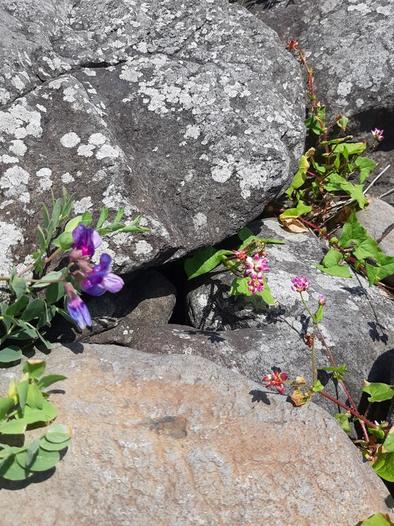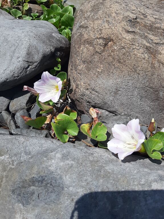 In the gaps between the rocks, Hamahirugao and Hamaendo flowers bloom, providing a sense of relief.