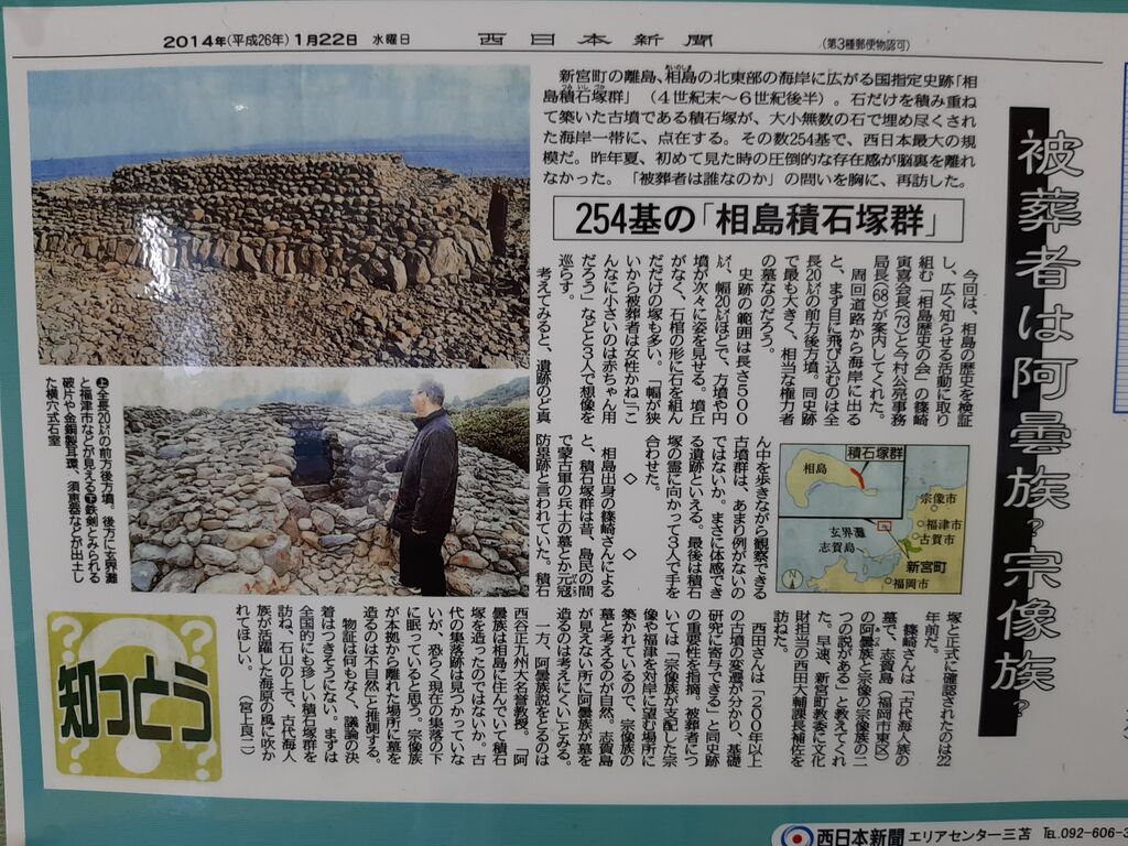 Whereas scholars on the Fukuoka side argue that the ancestral spirits of the Azumi Seafarer Tribe were enshrined on the island of Ai-no-Shima, which is located in the direction where the sun rises from Shikano-Shima Island.