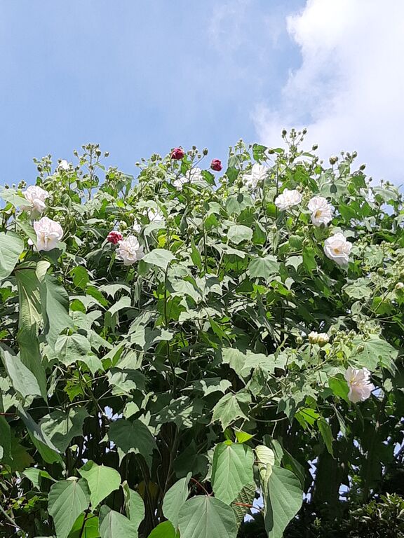 In the old village streets, hibiscus mutabilis were in full bloom.