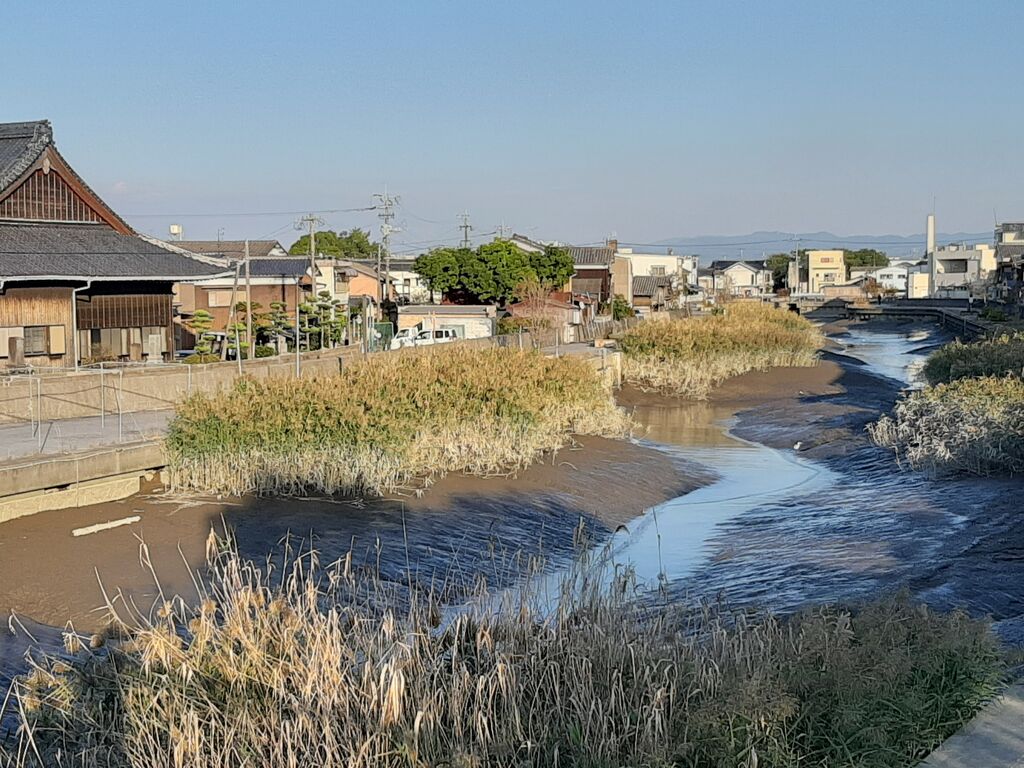 From the Suisan Bridge connecting the north and south of Okihata, I looked at the Okihata River and upstream, but perhaps due to low tide, the water level in the river was low.