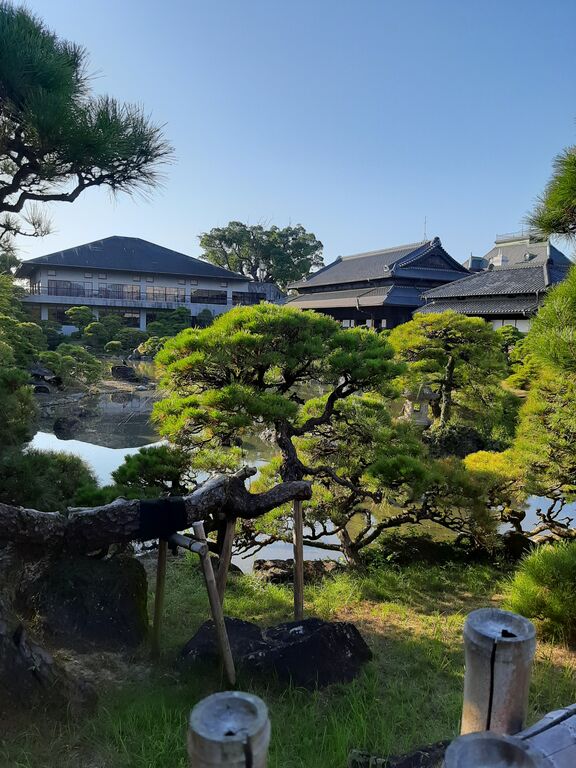 I didn't wait, but crossed the wooden bridge over the moat and left Pota Kichi, eager to catch a glimpse of Ohana's Sho-to-en garden through the pines.