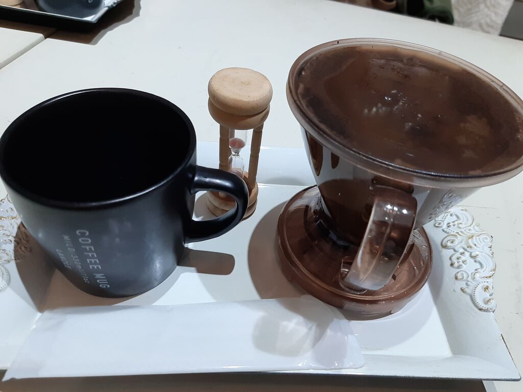 A "Clever Dripper" was brought with hot water poured into the coffee grounds, an hourglass, and a mug separately placed on a tray.
