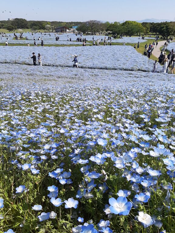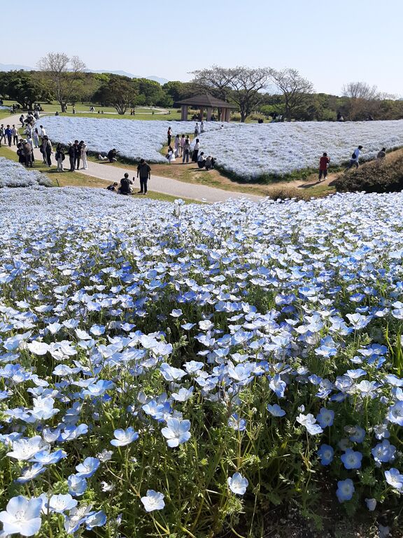 Inside the park, the nemophila flowers were in full bloom! We rode along the gentle park paths, and when we stopped to take a closer look, the hillsides were covered in soft, light blue flowers.