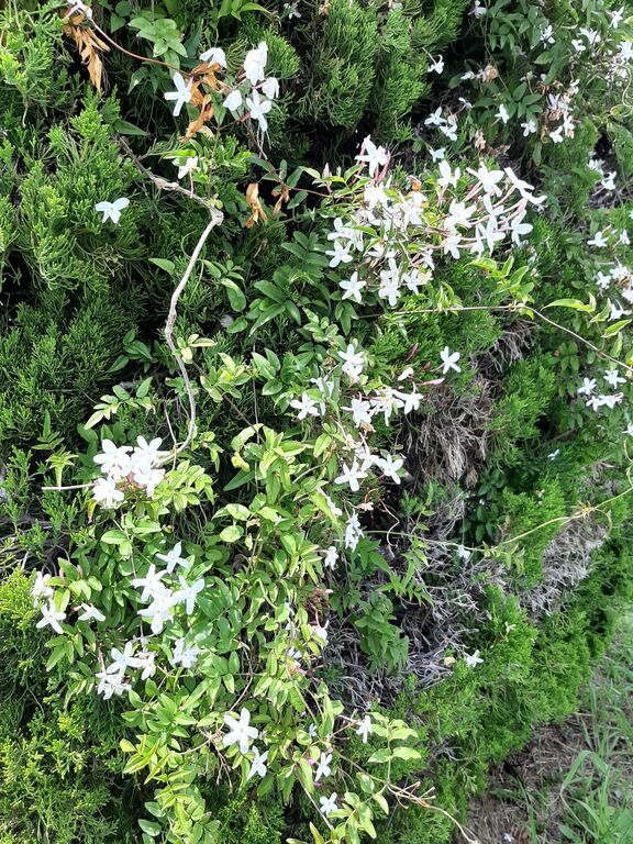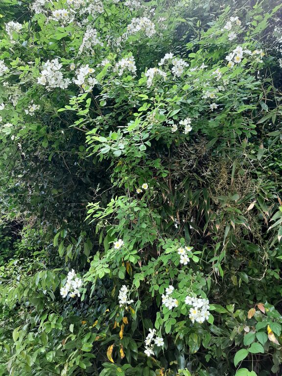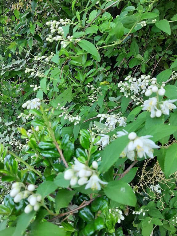 As I passed through the village paths, the white blooms of deutzia caught my eye, standing out vividly amidst the surrounding greenery.