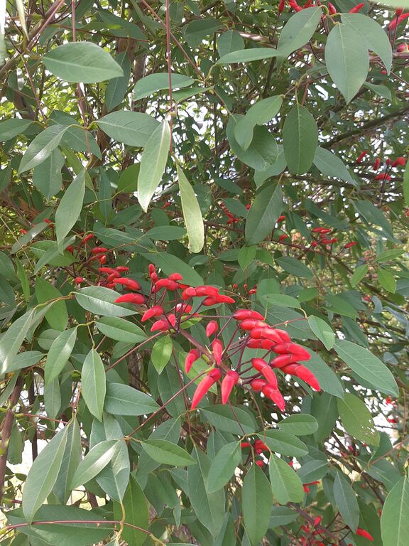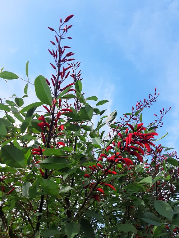 By the time I returned to my usual pottering route, the bright red buds of blooming deigo flowers were glowing in the light.